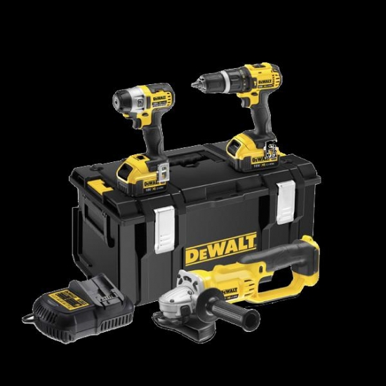 DCK381M2 termékszett tartalma: DCD785 18V-os ütvefúró-csavarozó, DCG412 18V-os sarokcsiszoló, DCF895 18V-os szénkefenélküli ütvecsavarozó, 2darab 4,0Ah Li-ion akkumulátor, univerzális töltõ, Dewalt DS300 Toughsystem szerszámtároló. | |||